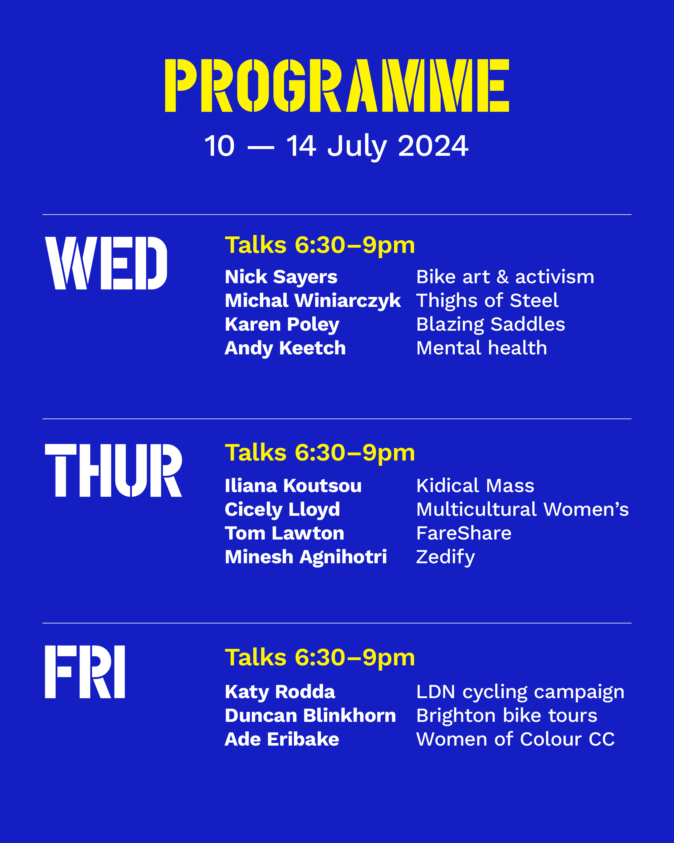 There will be 3 evenings of talks from local bike curious folk. The talks will cover topics such as ‘Kidical Mass’, cargo bikes, charity rides, art, activism, women of colour in cycling and the world naked bike ride.